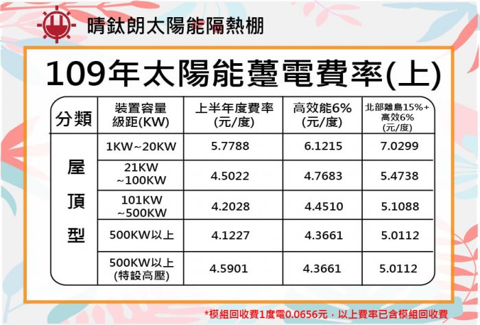 109年太陽能躉購費率 今年的躉電費率已出爐囉!相較於108年費率,降幅介於 0.34%~2.44%,經濟部為…