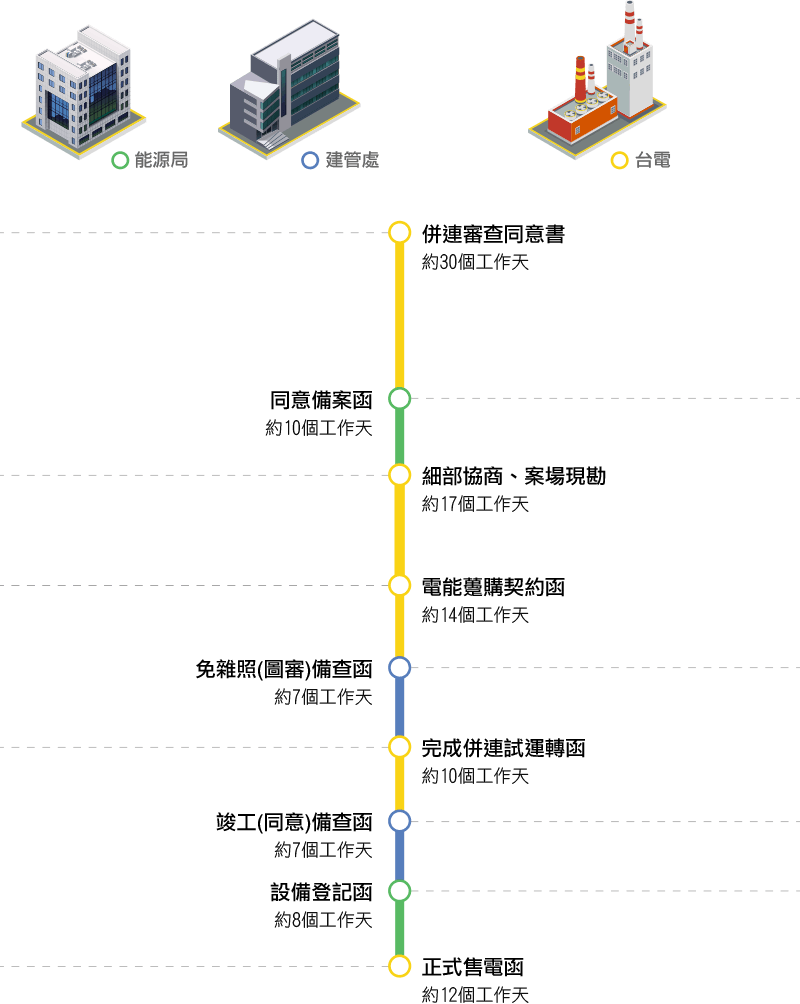 此跑件日(不包含假日) 為公家單位內部跑件流程大約時程,不包含送件前規劃及送件期間修改等時間。